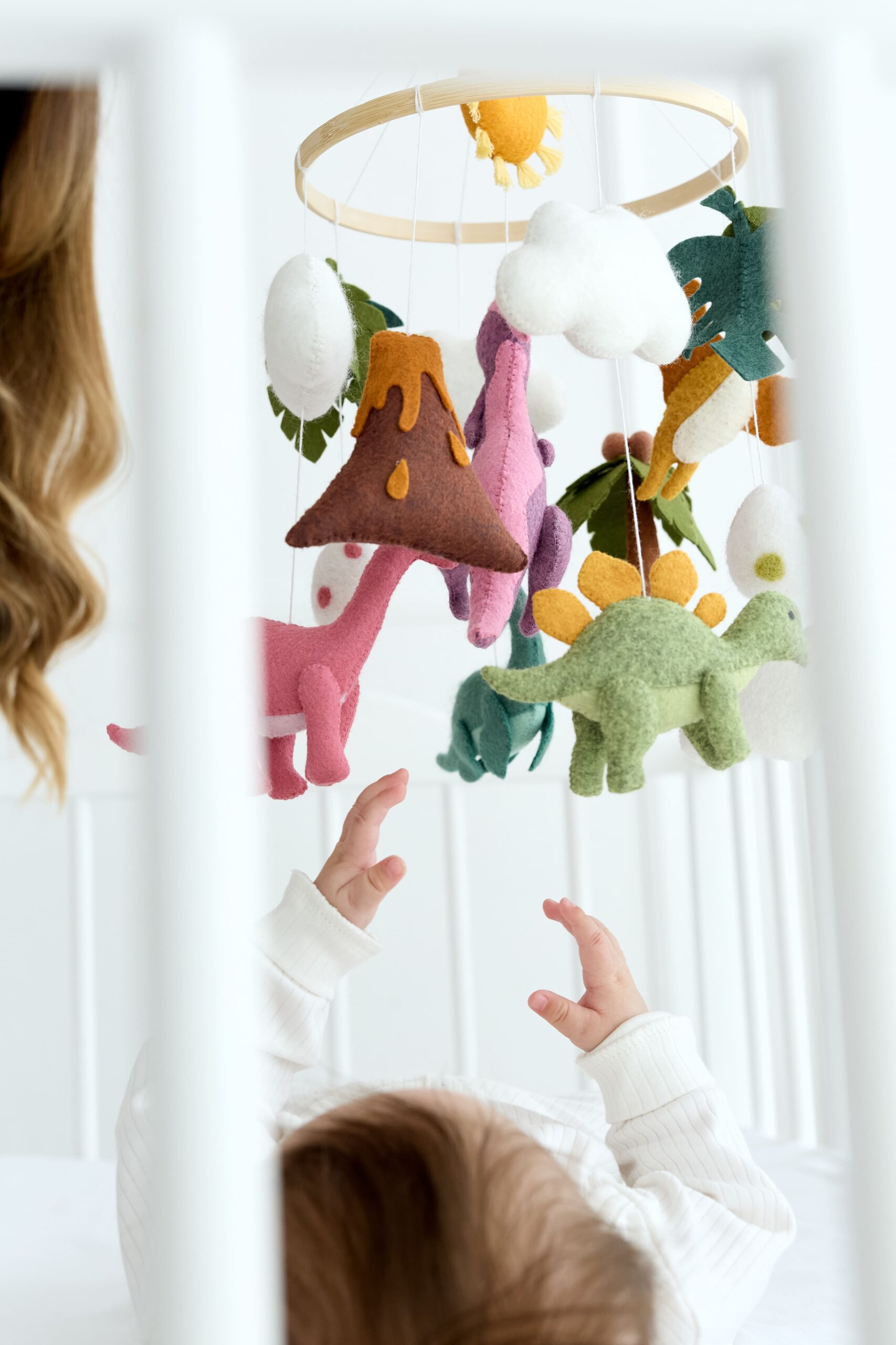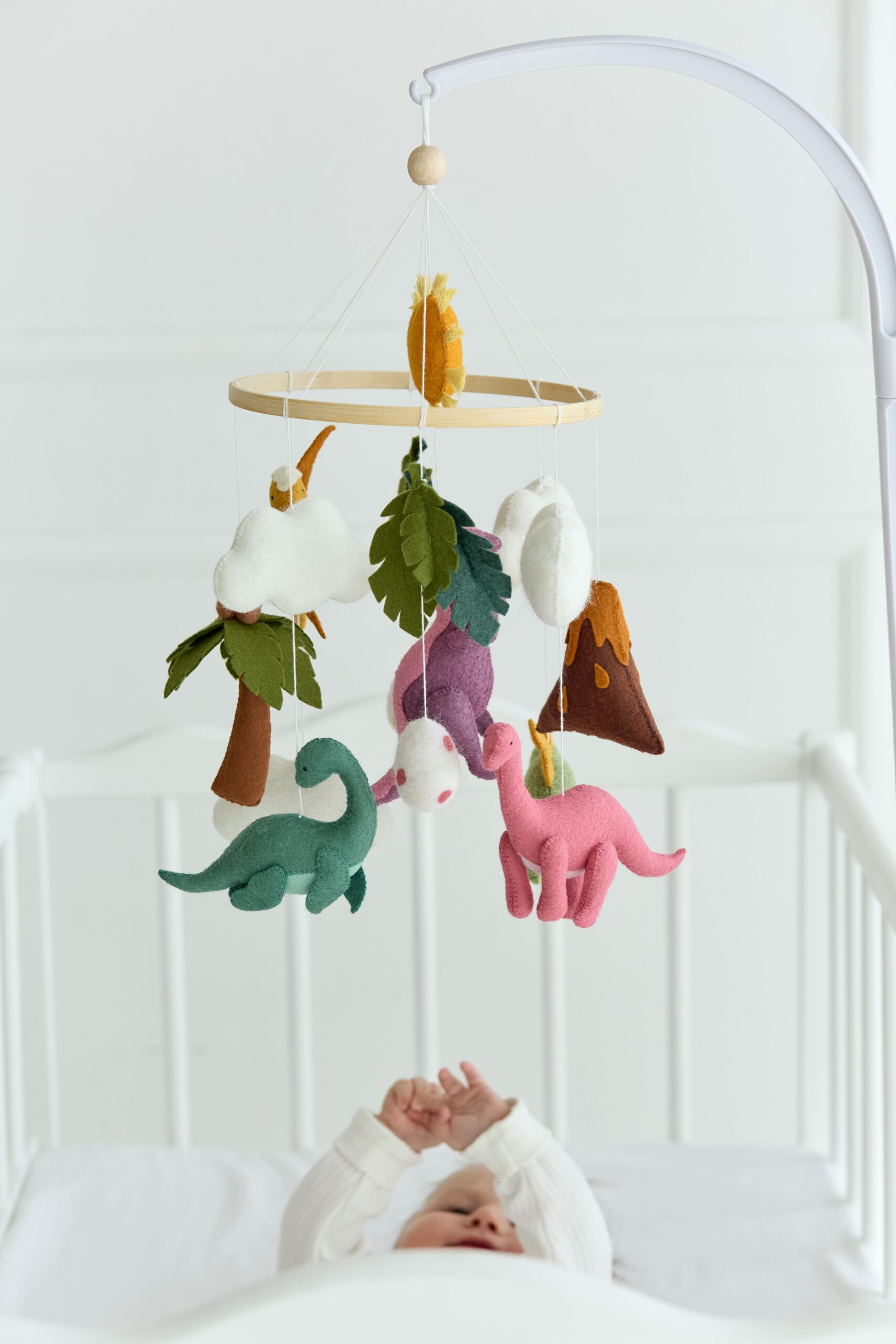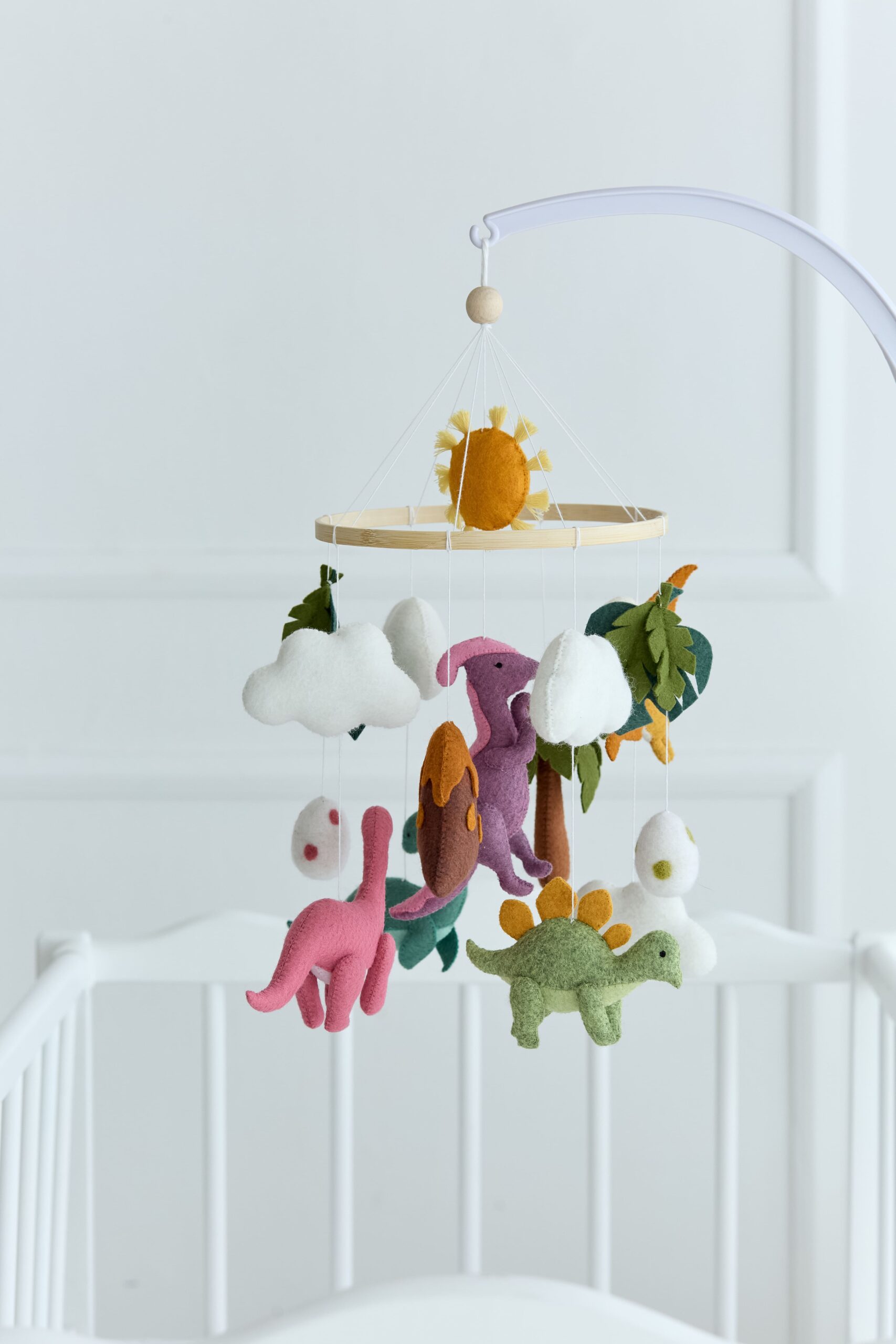 Мобіль на ліжечко “Історія динозаврів” створений для перших усмішок і казкових снів малюка. Чотири фетрові динозаврики різних відтінків зеленого 🦖🍃🟢 весело кружляють серед хмаринок ☁️, листочків 🌿, жовтого сонечка 🌞 та м’яких кульок, запрошуючи дитину в доісторичну пригоду.