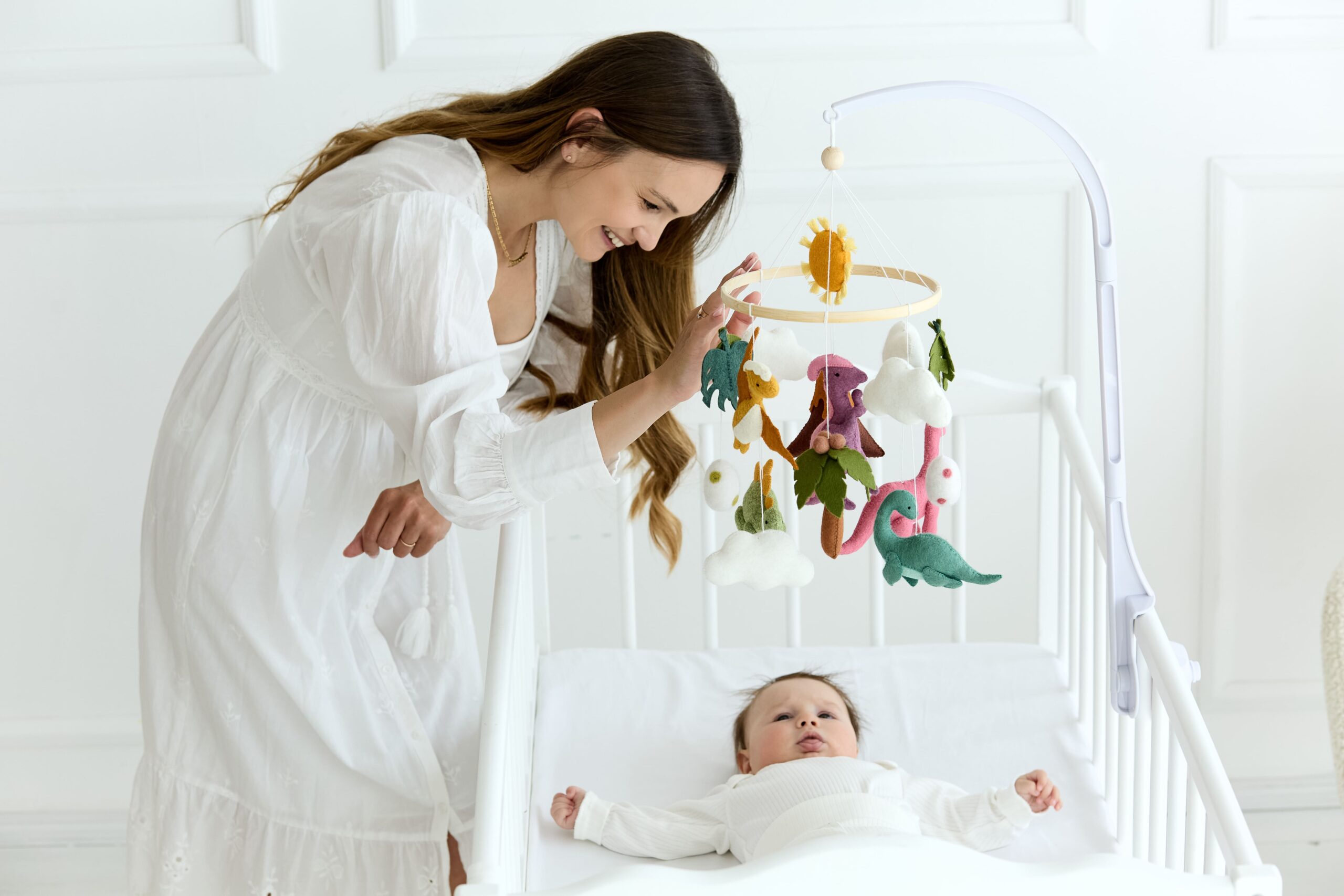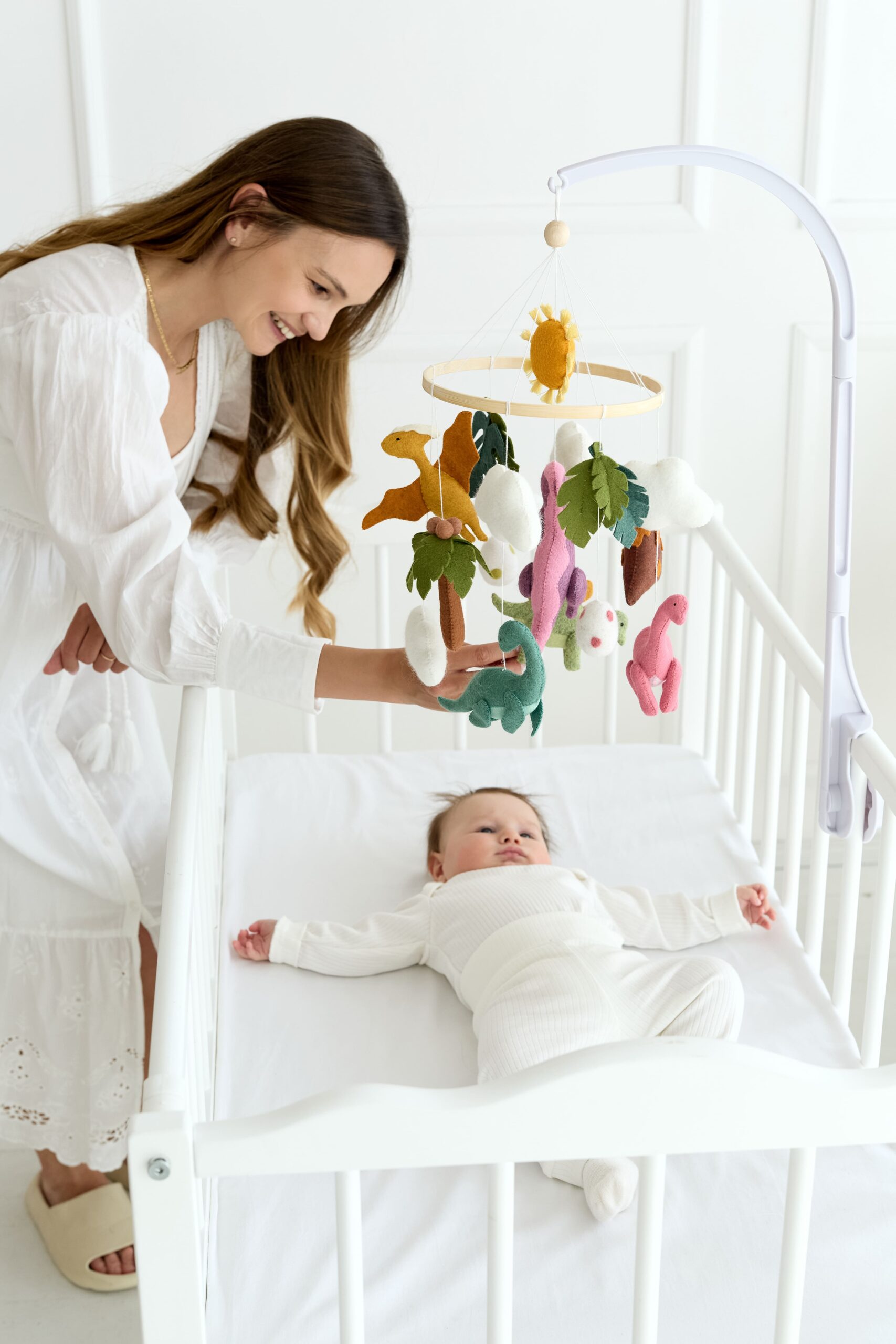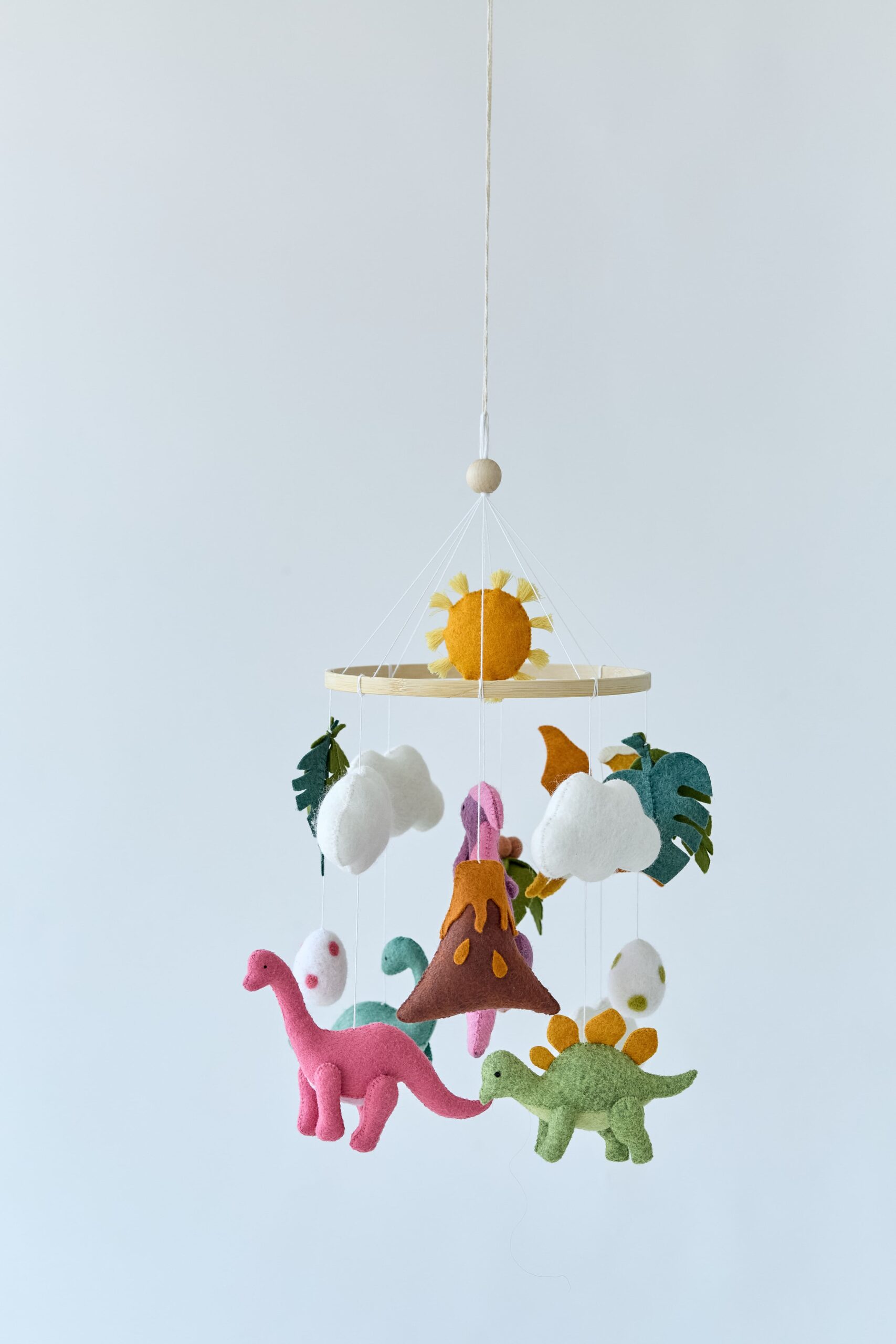 Мобіль на ліжечко “Історія динозаврів” створений для перших усмішок і казкових снів малюка. Чотири фетрові динозаврики різних відтінків зеленого 🦖🍃🟢 весело кружляють серед хмаринок ☁️, листочків 🌿, жовтого сонечка 🌞 та м’яких кульок, запрошуючи дитину в доісторичну пригоду.