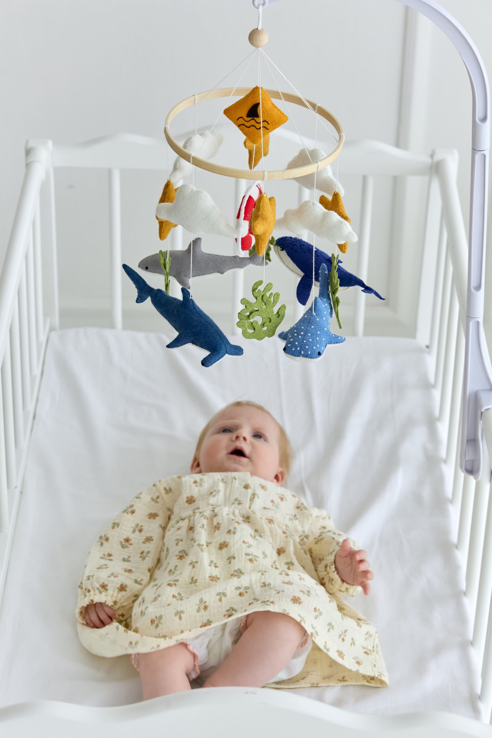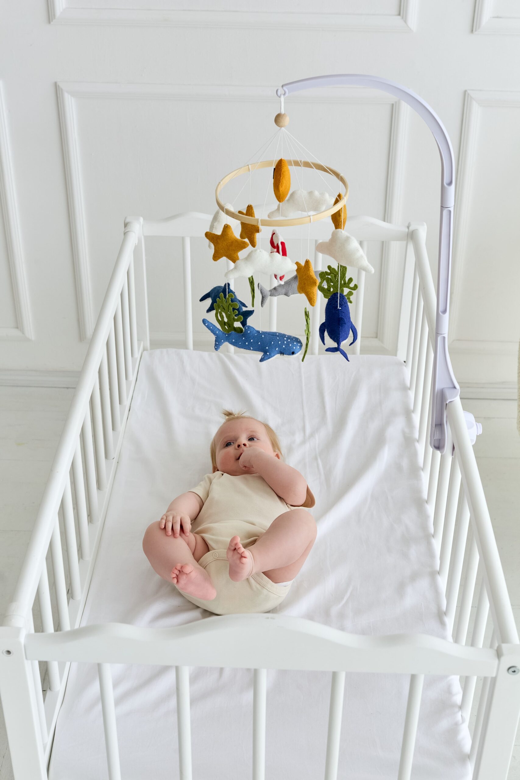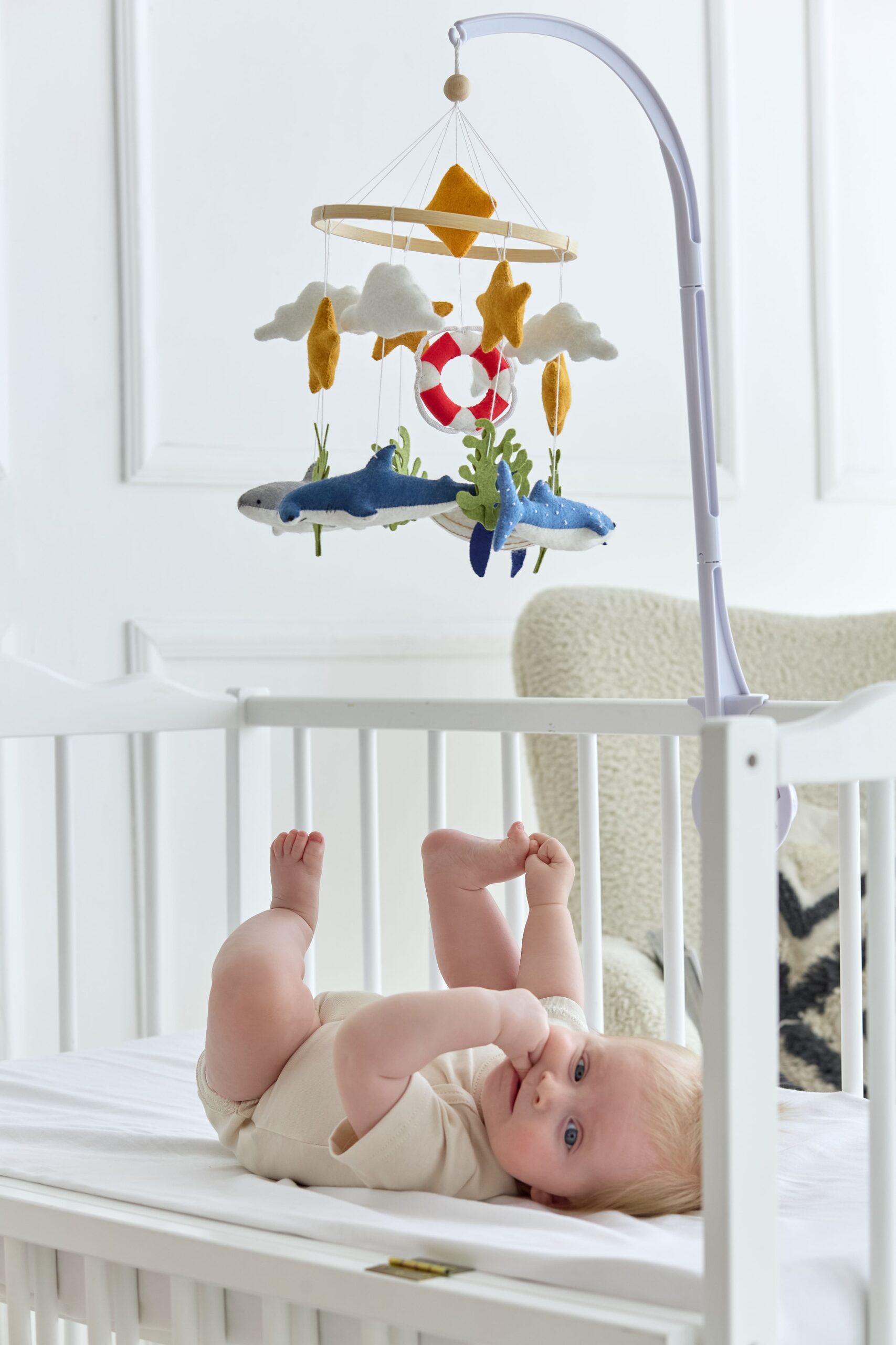 Поки дитина лежить у ліжечку, над нею пливуть хмарки ☁️, мерехтять зірки ⭐, а доброзичливі акули 🦈 та кит 🐳 розповідають казки про океан. Рух мобіля заспокоює, ритмічно налаштовує нервову систему, а контрастні форми стимулюють зорове сприйняття та концентрацію.