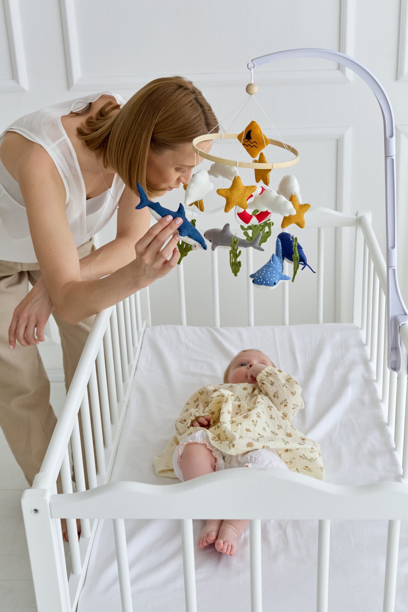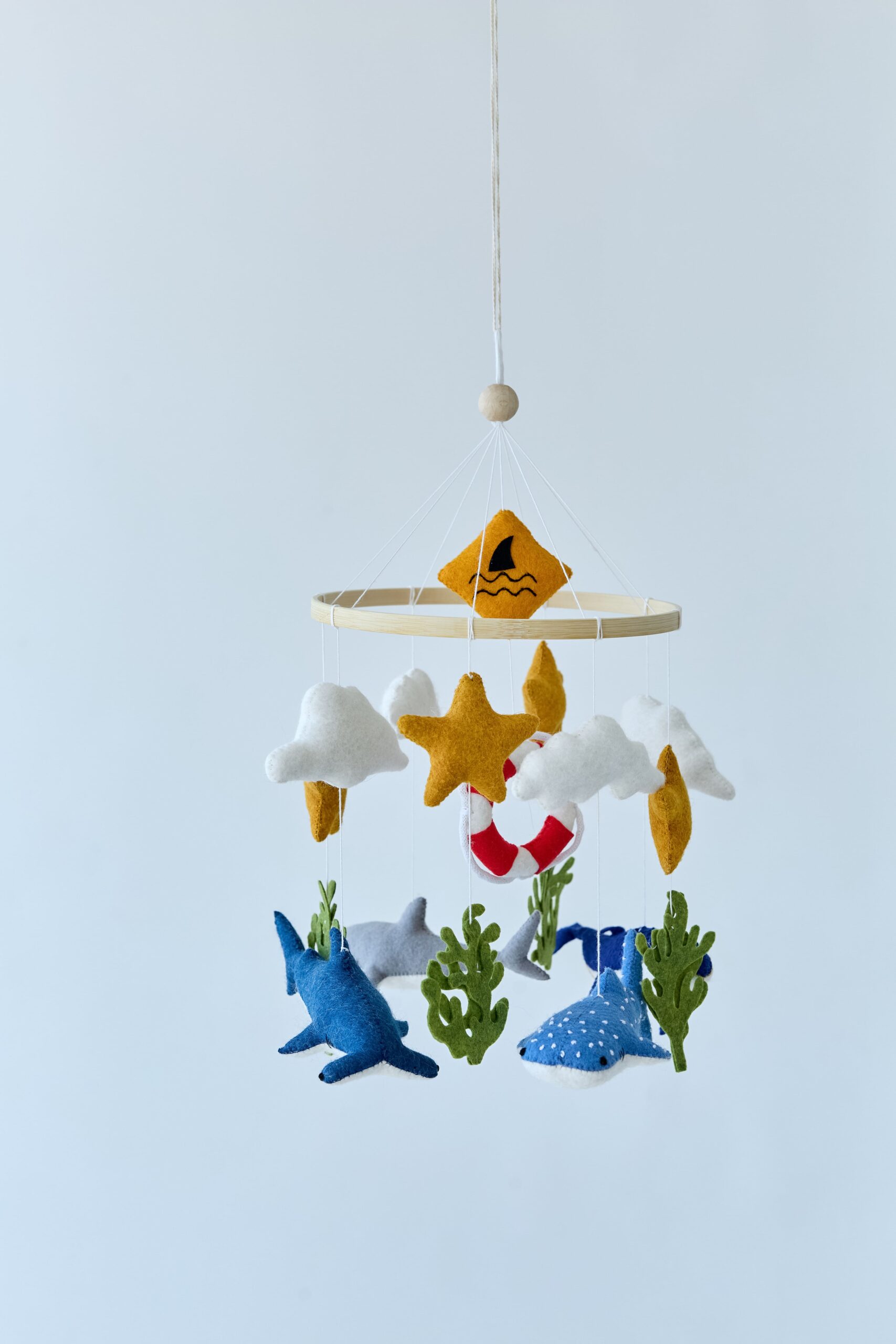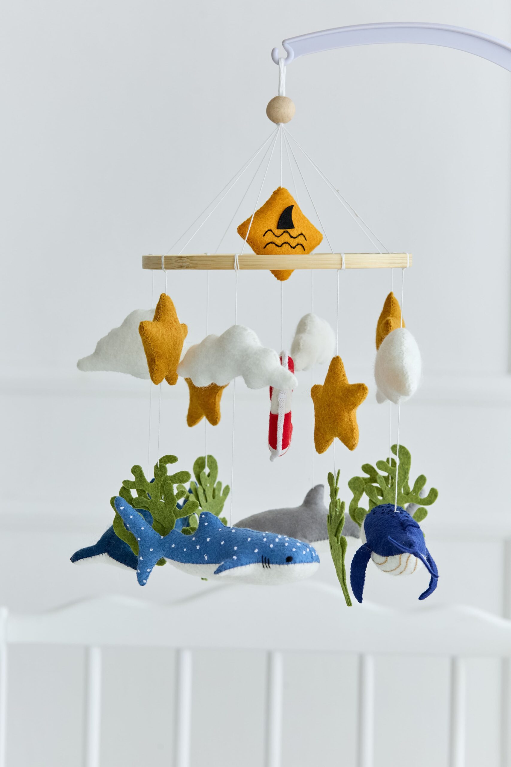 Поки дитина лежить у ліжечку, над нею пливуть хмарки ☁️, мерехтять зірки ⭐, а доброзичливі акули 🦈 та кит 🐳 розповідають казки про океан. Рух мобіля заспокоює, ритмічно налаштовує нервову систему, а контрастні форми стимулюють зорове сприйняття та концентрацію.